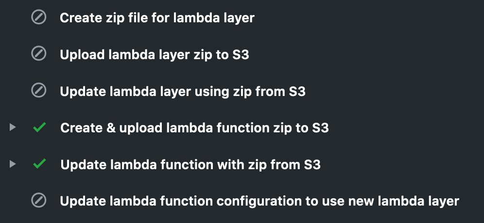 CI/CD pipeline that updates the lambda function. In this particular run, the layer was not updated, since the requirements.txt did not change. Corresponding YAML file here.