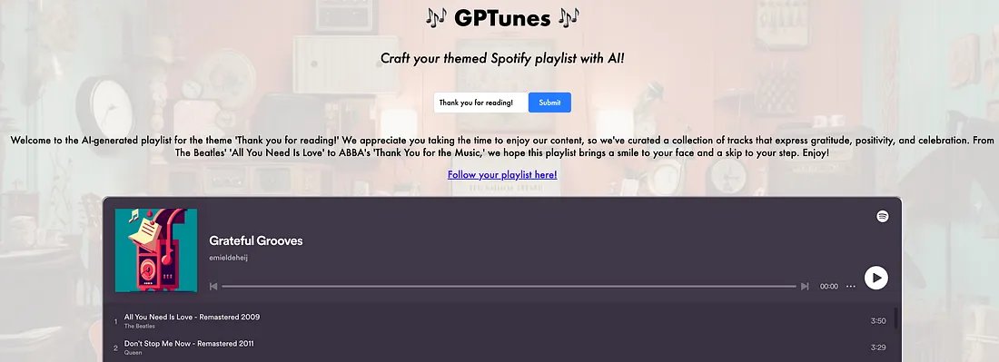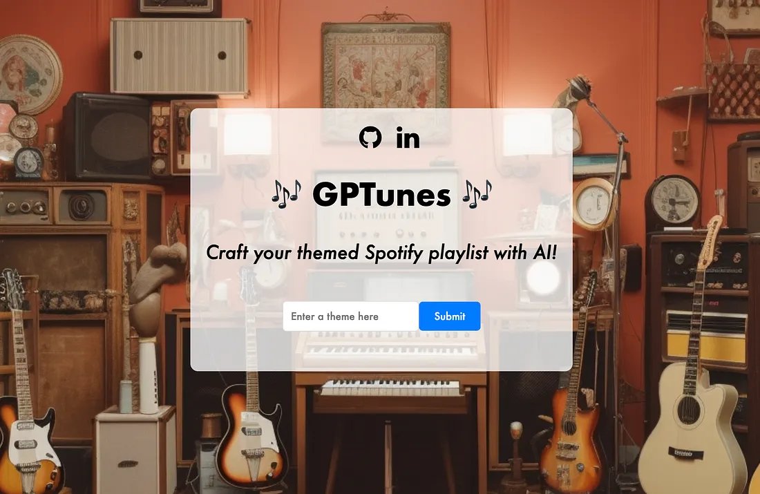 Have you ever wished you could automatically create an original Spotify playlist based on a specific theme? My side project, GPTunes, does exactly that! With this app, end-users can input their own custom theme and after some processing a playlist with a custom title, description and cover image is generated with generative AI, all in about 30 seconds.