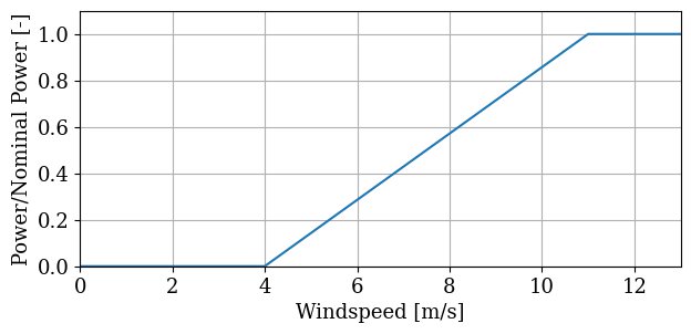 To map the wind speed to the turbine power, we estimated a speed-power curve from wind-turbine-models.com. The website lists numerous power curves, which typically show minimal power production until 4 m/s wind speed, and then linearly increase to nominal power at 11 m/s: