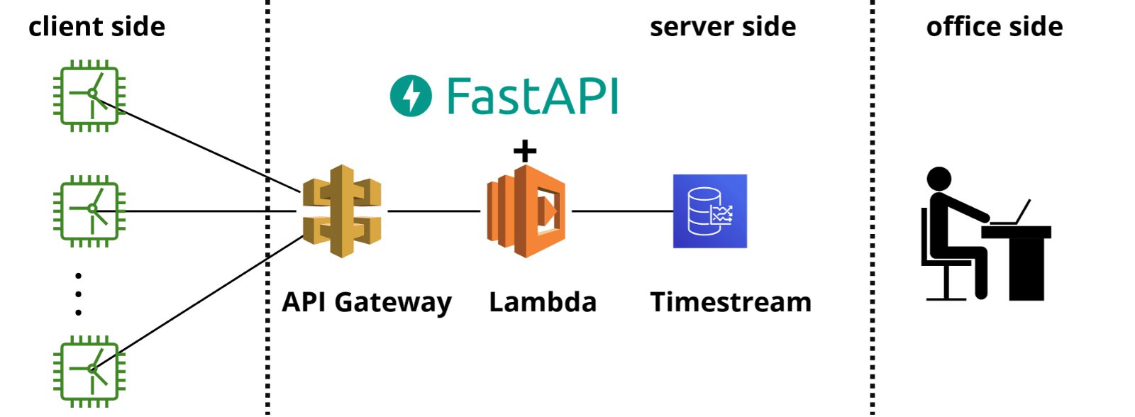 Data flows from left to right: data flows from turbines to API Gateway, to Lambda, to Timestream.