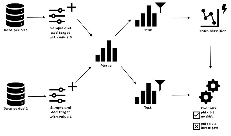 You start with two datasets from the periods you want to compare, without the label, because we’re considering only the features in covariate drift. You take a sample of both datasets. The easiest way is to take samples of equal size (or you need to correct the evaluation metric). You add the target variable, 0 for the old data and 1 for the new data. You merge the datasets and create train and test sets. Then, you train a simple classifier on the train set and evaluate the model on test. If the phi-coefficient is equal to 0.2 or higher, the model can find at least a weak relationship between the sets and labels[1], and you have to handle the drift. If the phi-coefficient is smaller than 0.2, you’re good, the model can’t find patterns and there’s no covariate drift.