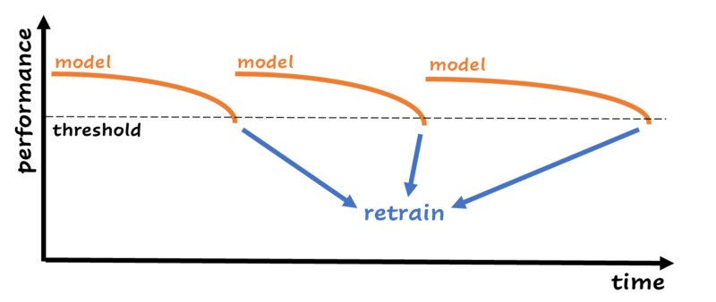 When performance drops below a certain threshold, the model is retrained with new data. This is just an example; in real life this chart can look in many different ways. Image by author.