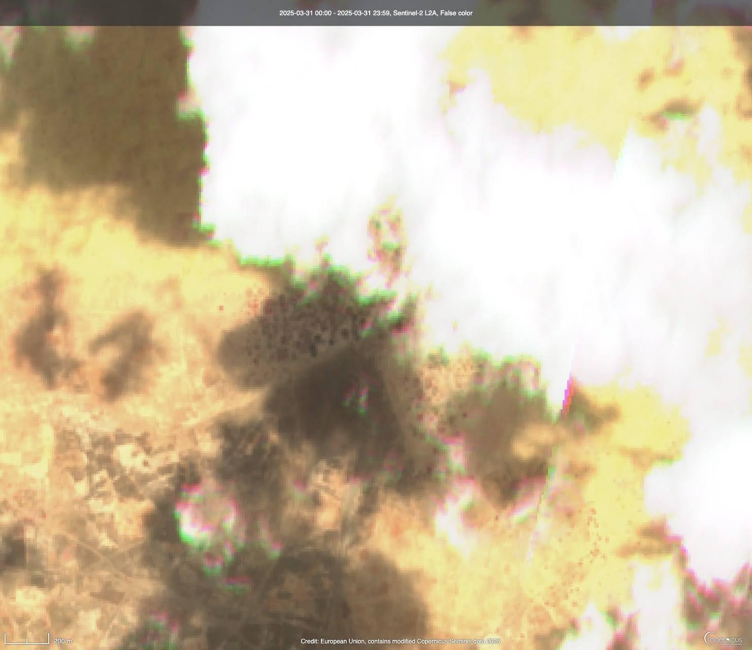The same location that has cloud cover obstructing our view. Obviously, this image is of little value for our purpose of inspecting burn scars.