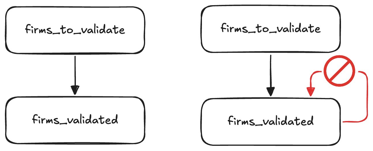 On the left we see the "ideal" scenario, where all validations succeed on the first try. On the right we'd check the output table to see which detections have already been validated successfully, using those to filter our input table. As you can see this turns our DAG into a directed graph, violating the assumption SQLMesh makes that a model can not depend on itself, directly or indirectly.