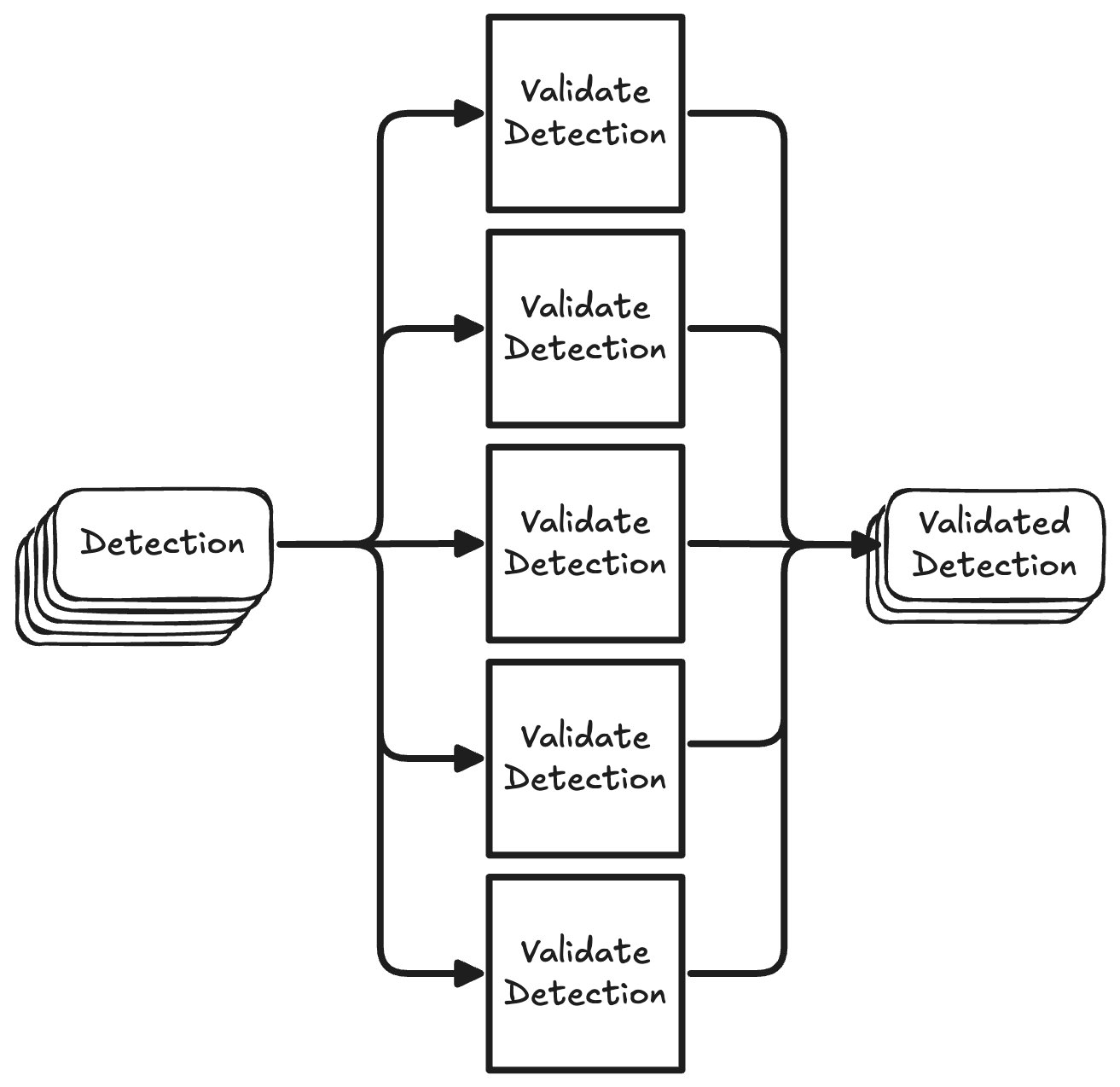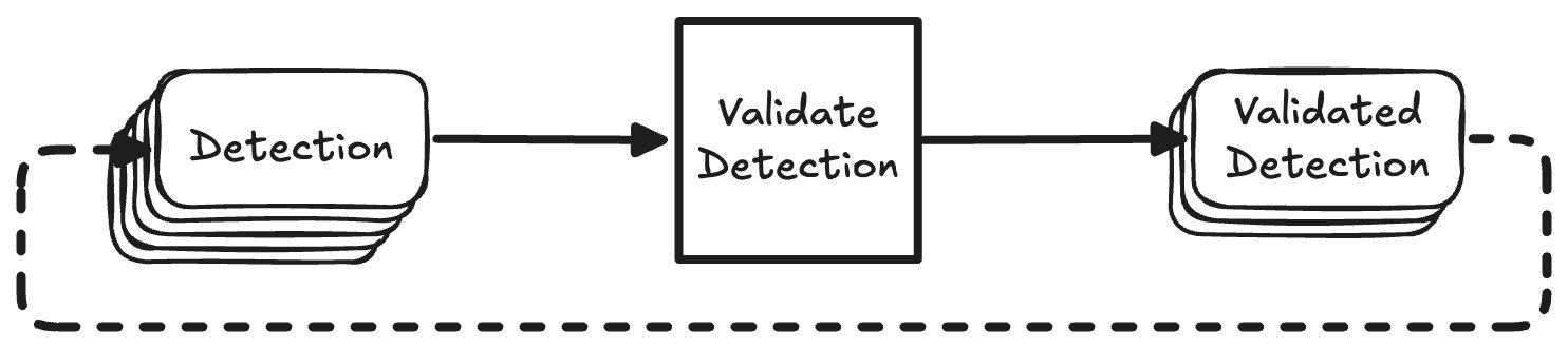 To give a simple example of how much time this saves let's say we have 100 detections. Each detection would take 6 seconds to validate. The total time it would take to validate all detections is 1006s=600s or 10 minutes. Now let's say we spawn 50 threads to process our detections in parallel. The first 50 detections would be done after 6 seconds, and all detections would be done after 12 seconds. Even in the worst case scenario where we had 101 detections, that last detection would be finished after 18 seconds. This means we get an improvement between 33 - 50x in terms of speed.