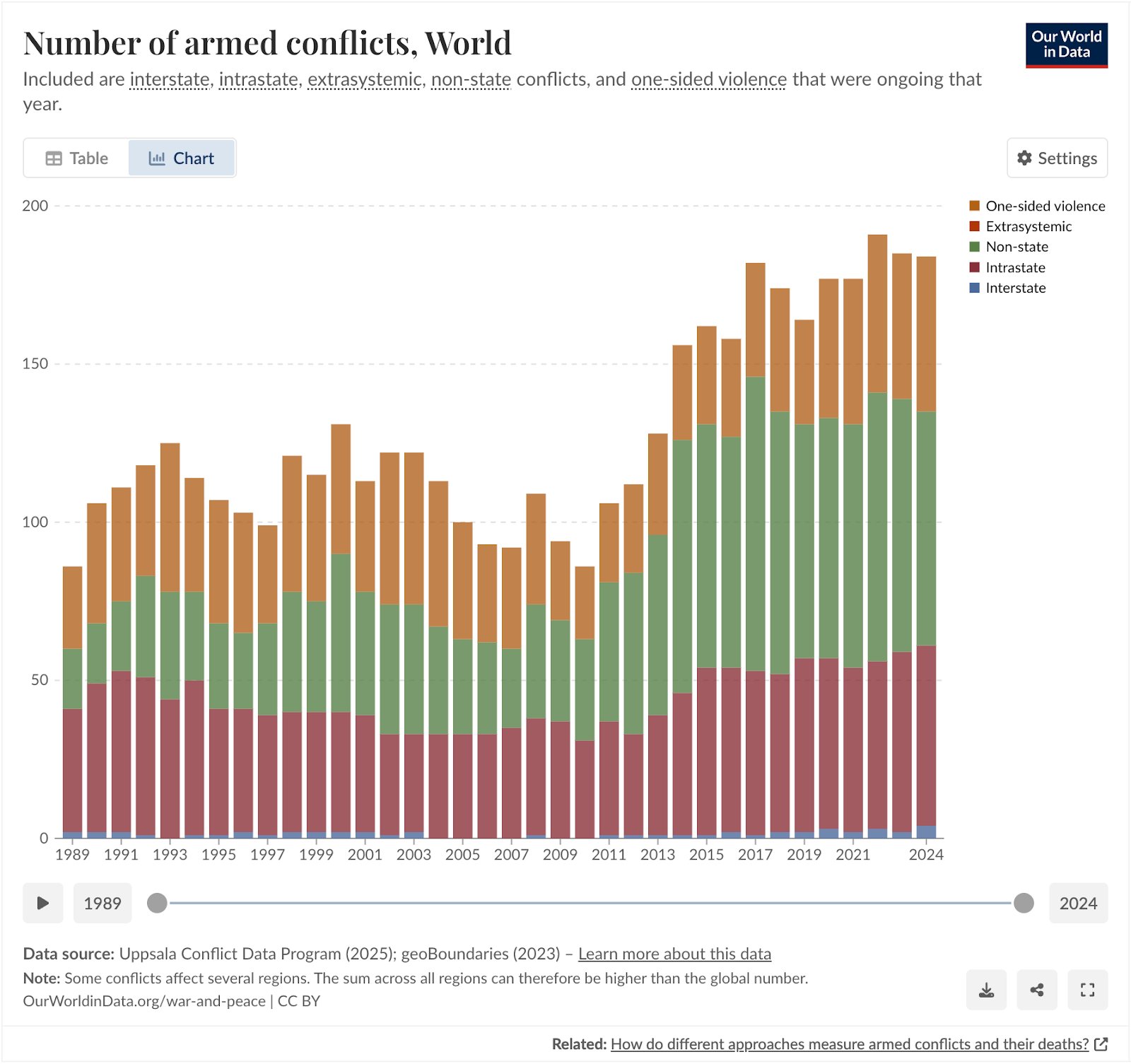 Number of armed conflicts in the world over time. Our World in Data