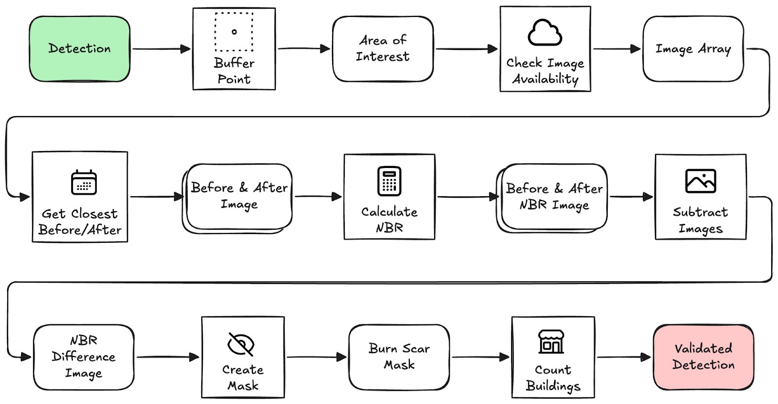 Once a fire detection passes the filters, we kick off a geospatial image analysis workflow in Earth Engine. At a high level this process looks as follows, I'll go through these steps in more detail soon.
