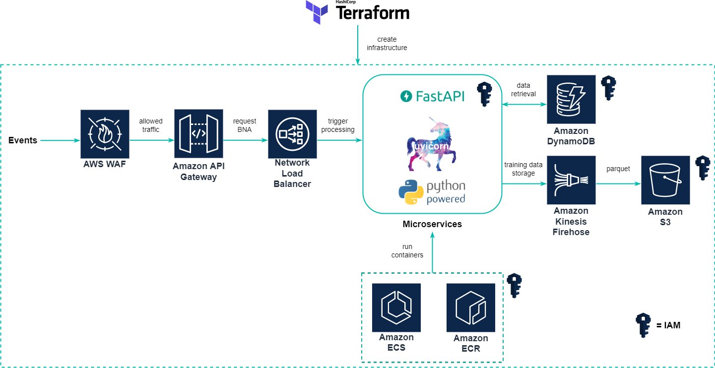 The BNA Orchestrator v2 was created with a microservices architecture using Python with FastAPI + Uvicorn running on an ECS Fargate cluster. The Docker images of the system are stored in ECR repositories with CI/CD taking place on GitLab. We used Terraform to leverage Infrastructure-as-Code principles to ensure the effortless creation of the system infrastructure. On the data management side, we chose to use schemas where possible and well-supported formats. For example, Pydantic was used for data models within the microservices, JSON for data exchange between services, and Parquet for data storage. AWS Kinesis Firehose with Glue schemas was instrumental in getting data stored properly for subsequent retraining of the ML models.