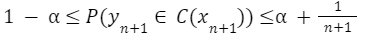 Step 1. The data is split into training and calibration sets. The model is trained as usual, resulting in a predictor for new data points. Since we want a prediction interval with statistical guarantee, the calibration set should be of a certain size. Given the following equation, where a is our specified confidence level, y₍ₙ₊₁₎ the value/class of the next data point,C(xₙ₊₁) the interval generated for the next input and n the size of the calibration set, we can derive the coverage guarantee.