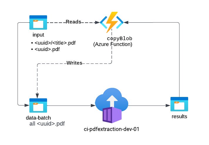 The function app selects unprocessed pdfs and uploads batches to the data-batch container at regular intervals. Then, the data-batch container processes them, and moves the output to the results container where it is stored.