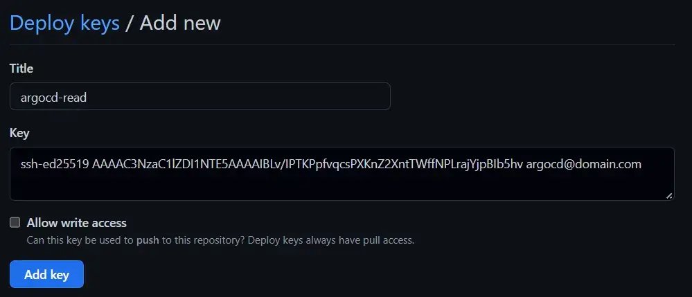 Now we will create a deployment-key for the repository where ArgoCD can obtain the K8s files. First create a keypair as described on any help page. Go to your repository keys (you need admin rights for this): https://github.com/<your.github.repo>/settings/keys.