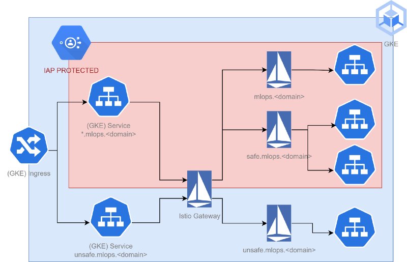 Now that the necessary external components are created, the cluster needs to be made accessible. Because we are using GKE and want it to be secured through IAP, it is necessary to make use of the GKE specific Ingresses available. A way to enable this in a nice way is to use Istio and implement it as suggested by the GCP documentation. I will not go into Istio in too much detail, just know that it allows you to do routing as shown in the picture below: