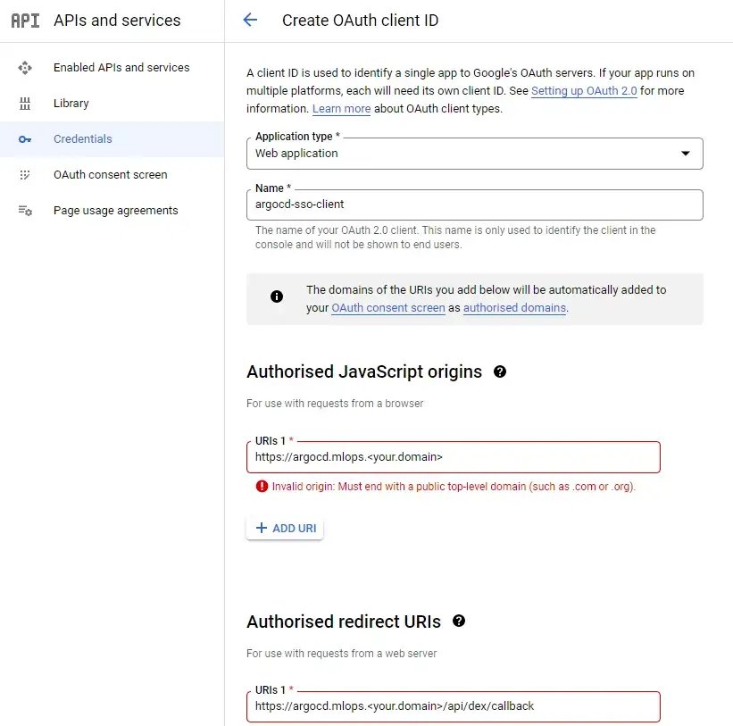 Next up is to create an OAuth credential. This credential is going to be used by ArgoCD to authenticate users through Google Oauth: