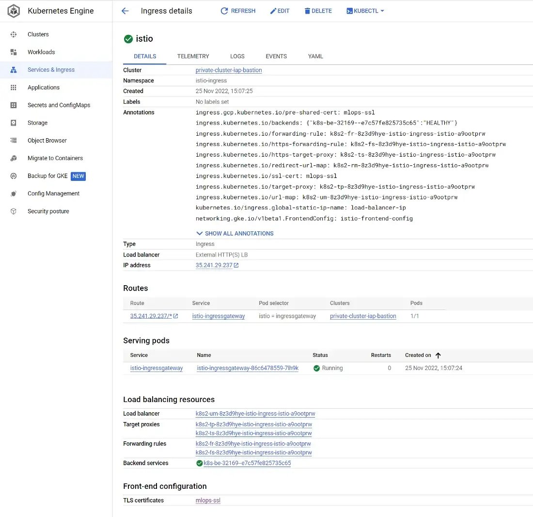 With the working certificate, the GKE Ingress can also be provisioned. Under the Kubernetes Engine Ingresses tab you can find the one and only Ingress created that secures our cluster: