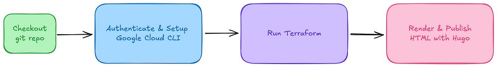 null_resourcein Terraform. This avoids splitting up the terraform configuration. Note: We runterraform apply -auto-approveon merge for simplicity. A nice improvement would be to additionally comment the output ofterraform planon your PR upon creation or an update. - Render & Publish HTML with Hugo — Hugo renders our Markdown files to HTML, and has built-in functionality to deploy to Cloud Storage.