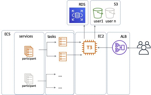 Figure 1: AWS workshop stack. It relies on ECS, EC2 and ALB for scalability and crash recovery. Each participant has a dedicated environment.