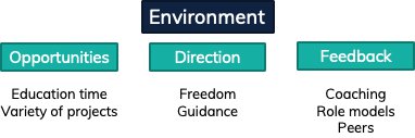 To be able to achieve your goals, there are three key ingredients. First, your environment needs to have opportunities, allowing for personal development. Second, you’ll need to define your personal ideal direction, within all those opportunities. And lastly, the environment needs to provide feedback, ensuring that you learn fast and you’re able to adjust your direction.