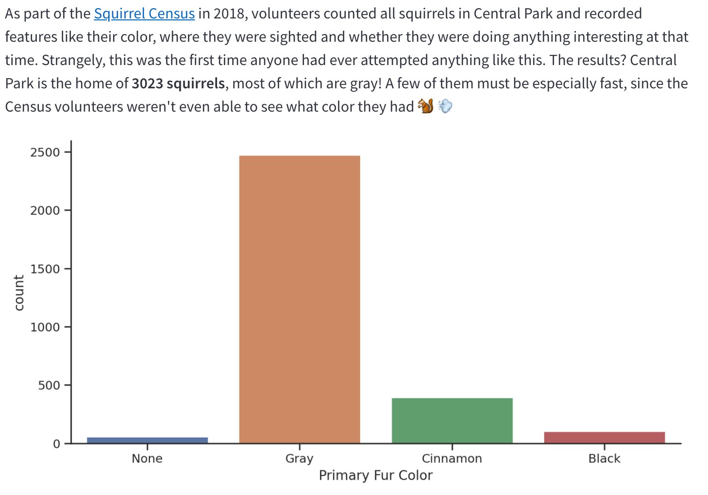 You can keep that page open as we add the next component of our app: a simple plot that shows the distribution of primary fur colors of our squirrel friends. Streamlit has a few built-in charting commands like st.line_chart and st.area_chart , but as we want something a little more fancy looking, we create a Seaborn count plot from our data. Since Seaborn is built on Matplotlib, we can display the resulting figure using st.pyplot .
