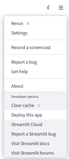 When you run your app locally, you'll find a 'Deploy this app' option in the hamburger menu in the top right. Click this, walk through the interface and voila! You've hosted your own interactive Python application online. Alternatively, you can also go to share.streamlit.io and deploy your app from there. Feel free to clone or fork the Github repository, check out the Streamlit documentation and try to come up with your own features. Good luck!