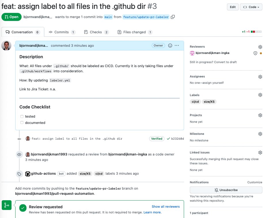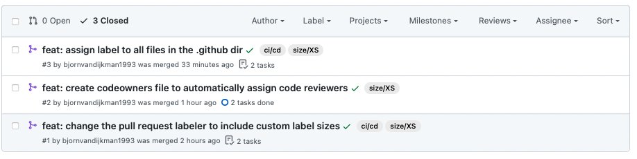 Pull requests that contain more than 250 lines will be labeled as Too Large, because nobody got time for that. You can assign labels based on the subdirectory in which the code was changed in the following file .github/labeler.yml :