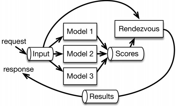 Figure 1: Rendezvous architecture as described in Machine Learning Logistics. The models are evaluated in parallel and place their result on a stream. Results are then collected from this stream and the best result is used.