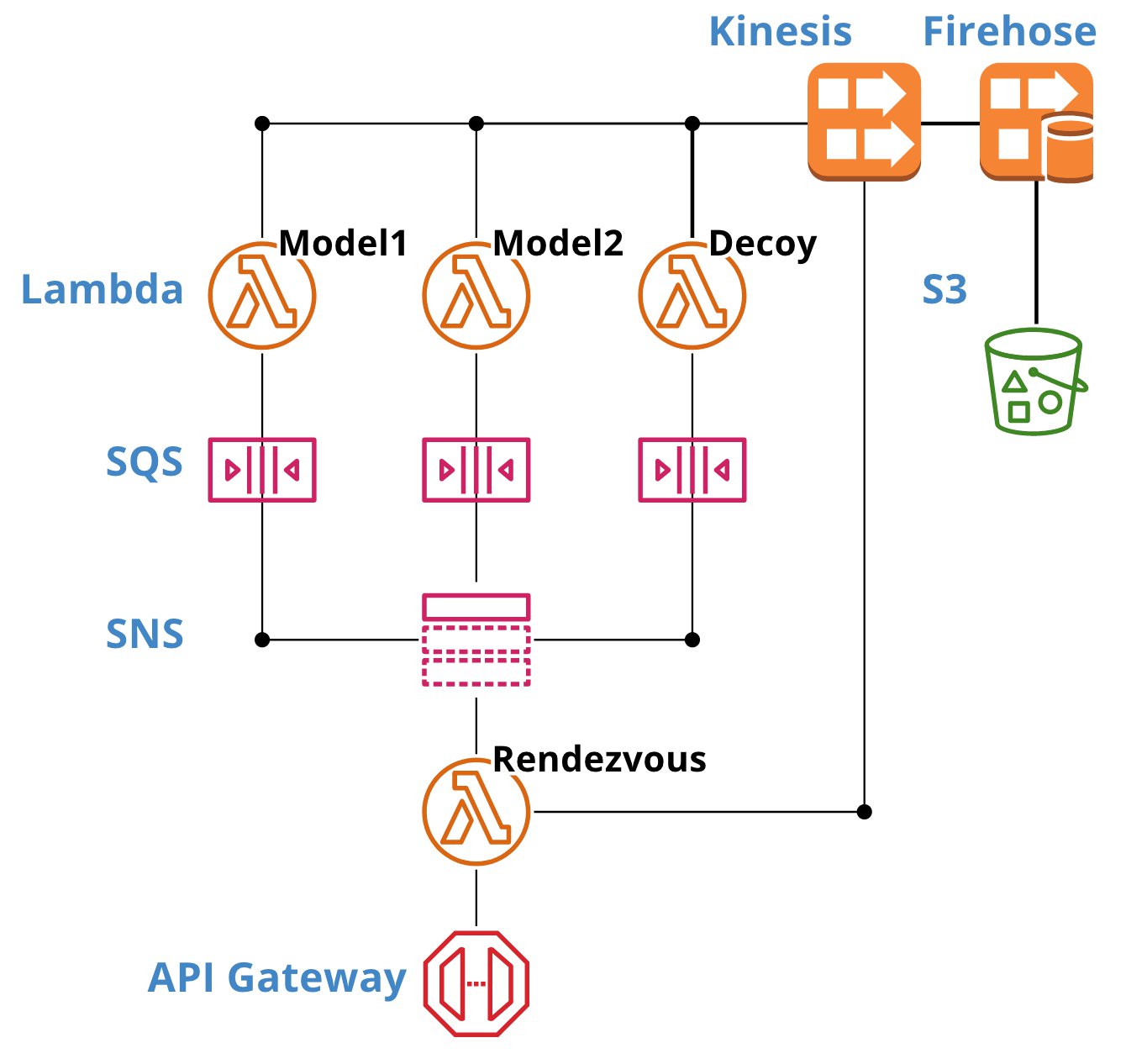 - Each Lambda function runs a model. In Figure 2 these are decoy, model1 and model2. Model1 and model2 may be different versions of the same model. The decoy model only forwards the incoming data from the SQS queue to allow for monitoring and debugging.