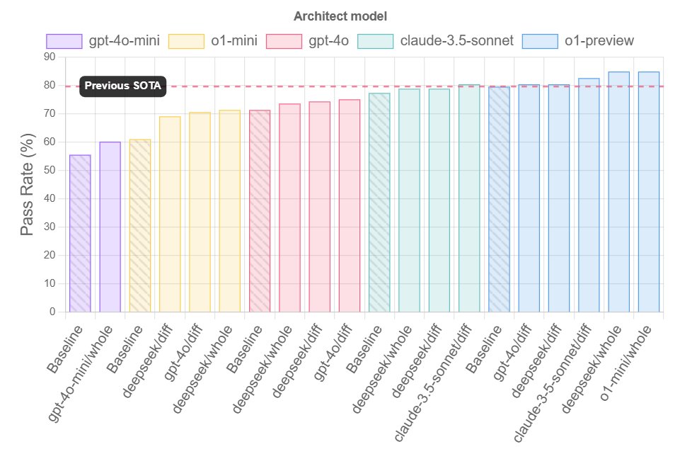When OpenAI released the o1 models, it started to make sense to play to the strengths of different types of LLMs. An important consideration regarding these models is that they excel at reasoning tasks but sometimes struggle with code suggestions. That’s why Aider suggests splitting the general task of programming into two separate processes, that of reasoning and editing. One LLM has the role of “architect”, asked to describe how to solve a coding problem, while another would be the “editor”, producing specific coding suggestions or changes based on the architect’s description of the solution. This approach achieves higher scores than individually assigning each LLM to solve the benchmark exercises, making it an interesting LLM-powered pair-programming partner. Find the results for Aider’s programming benchmark below.