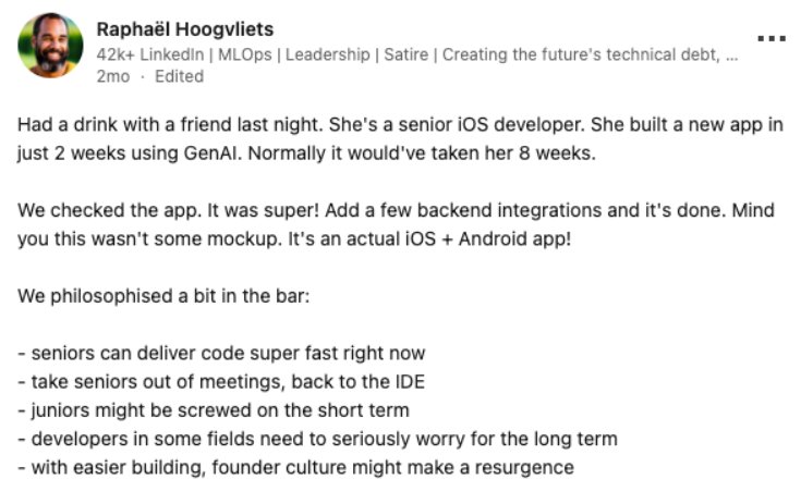 A more indirect effect is that the adoption of AI assisted development lowers the ramp up time for junior developers and newcomers. These tools serve the role of on demand mentors, providing examples and explanations that help less experienced programmers learn best practices faster. You can point an AI to a code base and ask it to explain it to you like you were 10 and you will get the gist of it. So just like contributing to the code, these tools accelerate onboarding of new colleagues to projects or topics and boost confidence. A study by McKinsey shows that this effect depends on the complexity of the task at hand but that the programming skill gap between junior and senior developers is shrinking. This will lead to significant ripples in the job market.