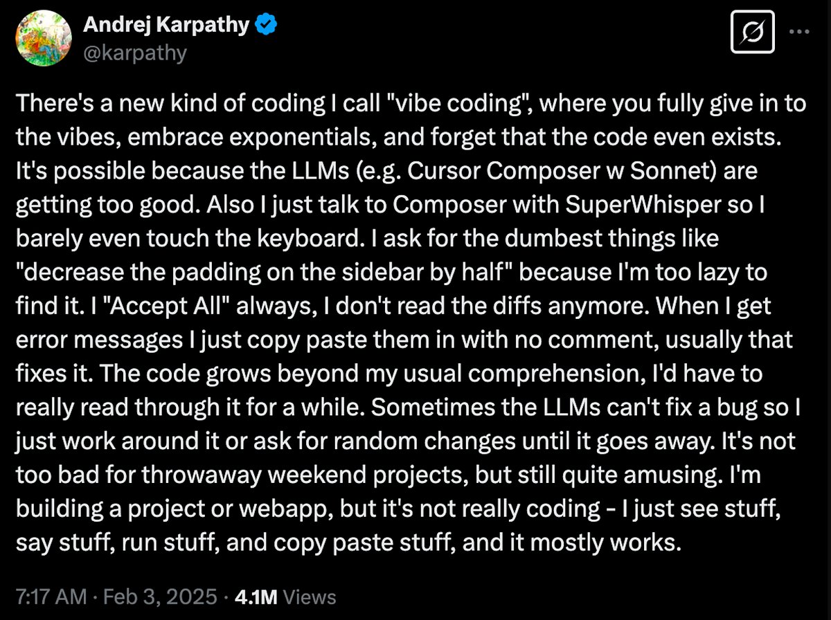 A new term was coined for this flow in February by none less than Andrej Karpathy, top tier AI legend and former AI director at Tesla, and has since then gone viral: vibe coding.