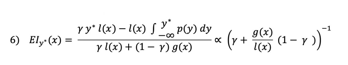 In Bayesian Optimization the hyperparameters that are put forward for evaluation by the objective function are selected by applying a criterion to the surrogate function. This criterion is defined by a selection function. A common approach is to use a metric called Expected Improvement. For a TPE-based surrogate function, the Expected Improvement is given by the following equation: