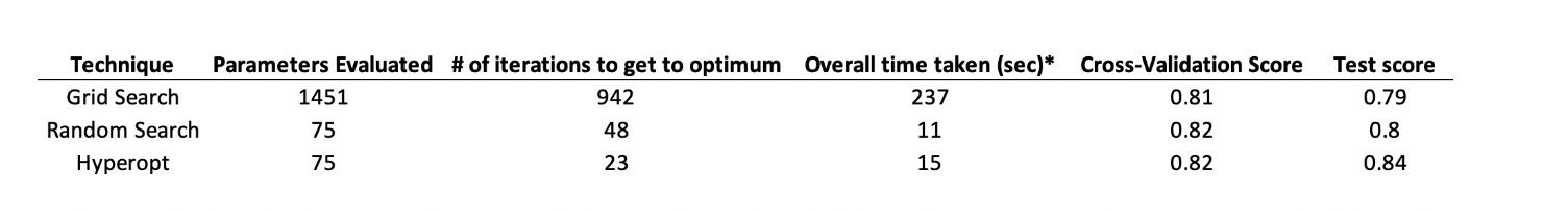 Let us run GridSearch, Random Search and our Hyperopt function on the parameter grids defined above. The latter two require the number of iterations to be specified, which we will set at 75 for both so that we have a level playing field.