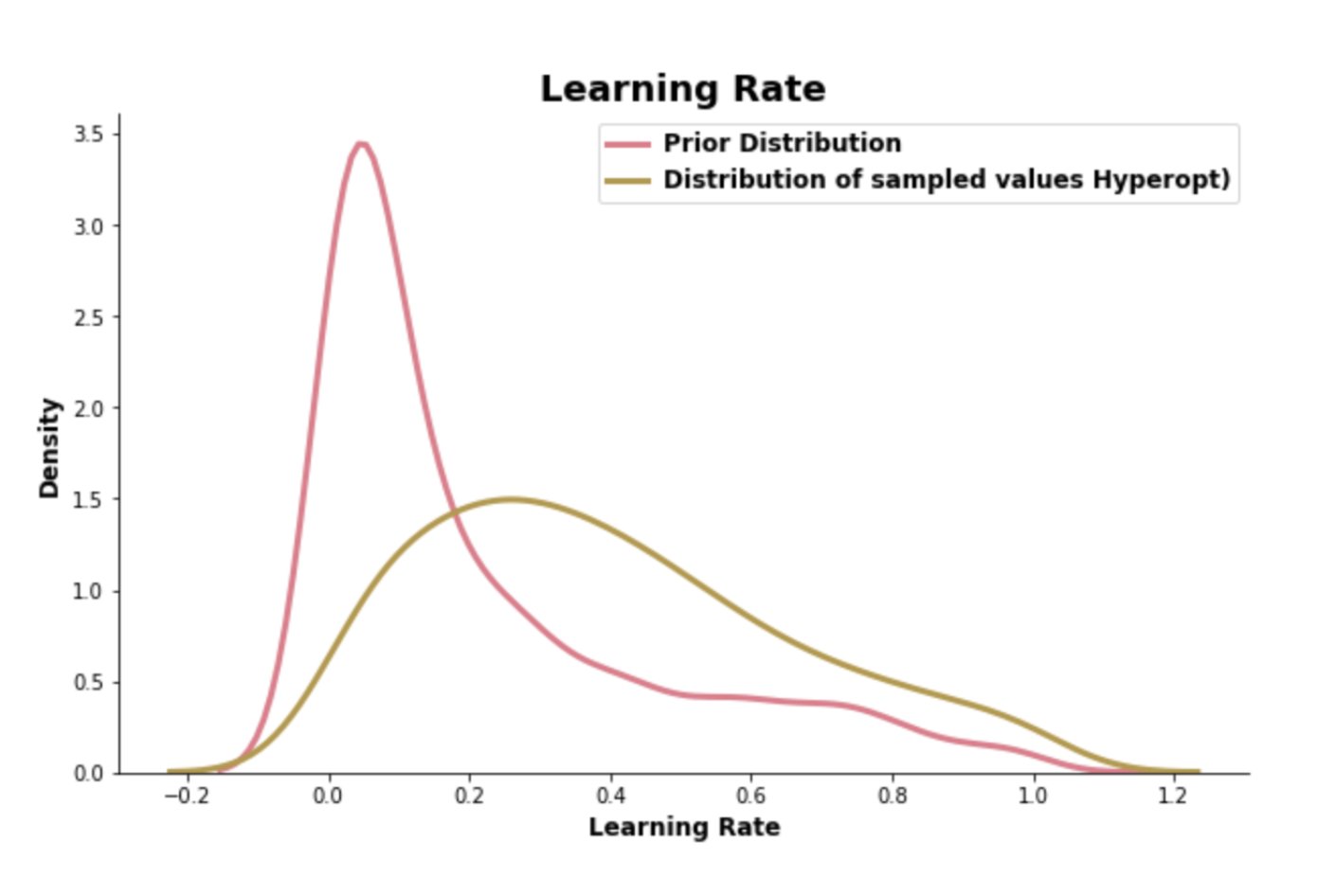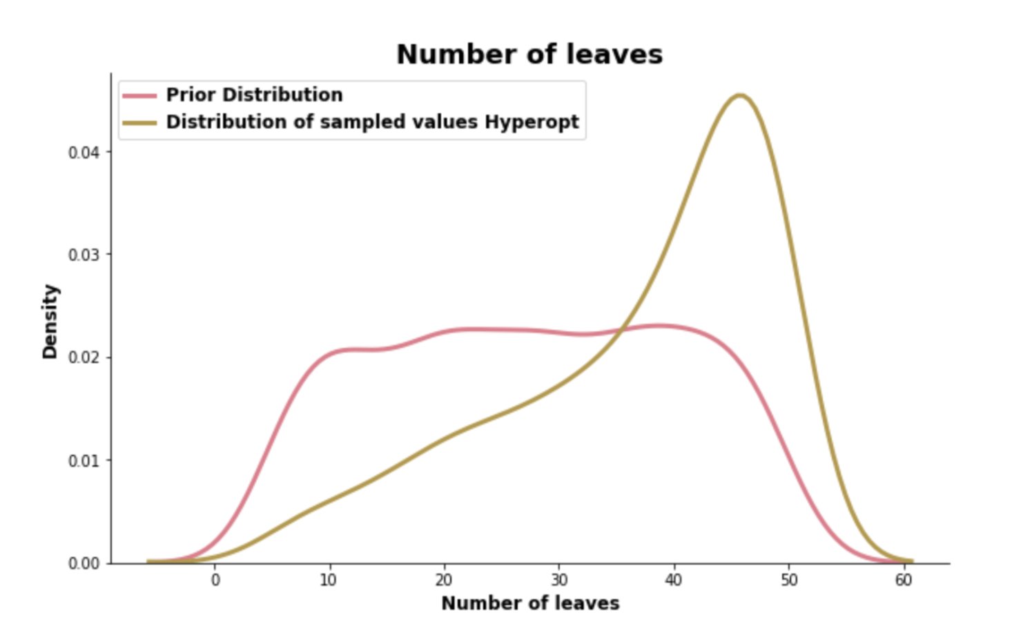 As it evaluates hyperparameter combination by hyperparameter combination put forward by the surrogate- and selection function, it gradually focuses more and more on a specific area of each hyperparameter distribution. Based on past evaluations, it believes that this is where it should be able to find better cross-validations scores. The distribution plots of the learning rate and the number of leaves shown below clearly echo this approach.