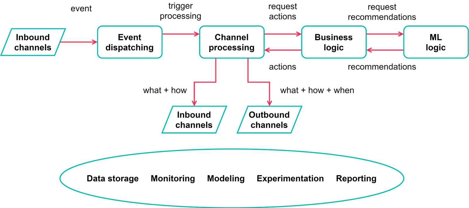 An NBA platform consists of the components shown in the diagram below. At the start, events flow from inbound channels to an event dispatching component. This event dispatching is similar to the reception at a hotel that directs people where to go, with people taking the place of events. The event dispatcher could do some minor processing and then trigger the processing of the received data based on the channel on which it arrived. Channel processing makes sense of the event at the technical level. This is needed because two channels are rarely equal and require processing specific to the channel. After finishing with its processing, the channel processor requests actions. Upon receiving the request, the business logic applies rules and conditions that determine the possibilities or limits of the NBAs that will be calculated. For example, consider the situation in which giving a 90% discount is a possibility. Giving such a discount to all customers would result in the happiest customers but also bankruptcy. In this situation, some boundaries and eligible actions need to be defined, which fit into the business logic.