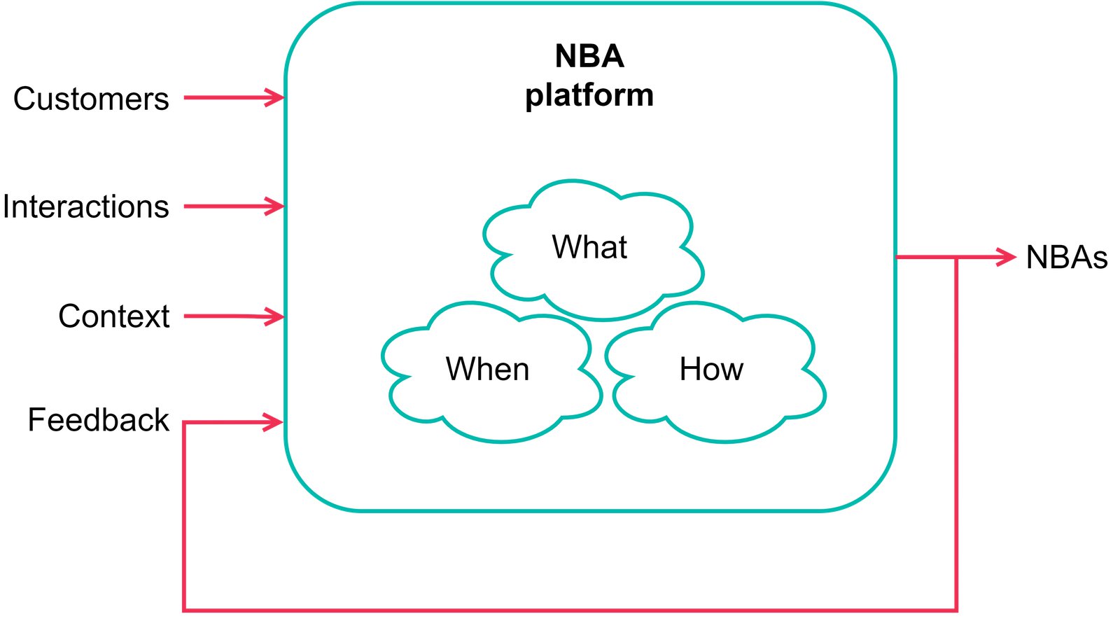 An NBA platform decides the best way to interact with a customer. It does so by calculating one or more actions that are relevant to the customer. These actions can range from offering a product or service, inquiring about missing information or sending a gift. Performing the action should result in the customer having a better relationship with the business. Such a better relationship would ensure greater customer loyalty and satisfaction. In simple terms, an NBA platform needs to know about customers and their interactions to determine actions within a context with feedback to improve continually. All of these ingredients form the view shown below.